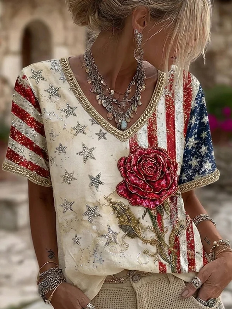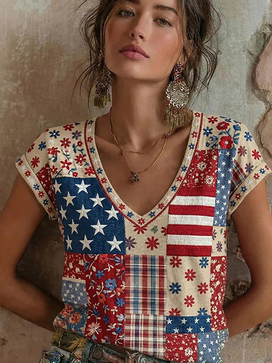 Women's Vintage American-Style Floral Patchwork & Print Casual Cotton-Linen T-Shirt
